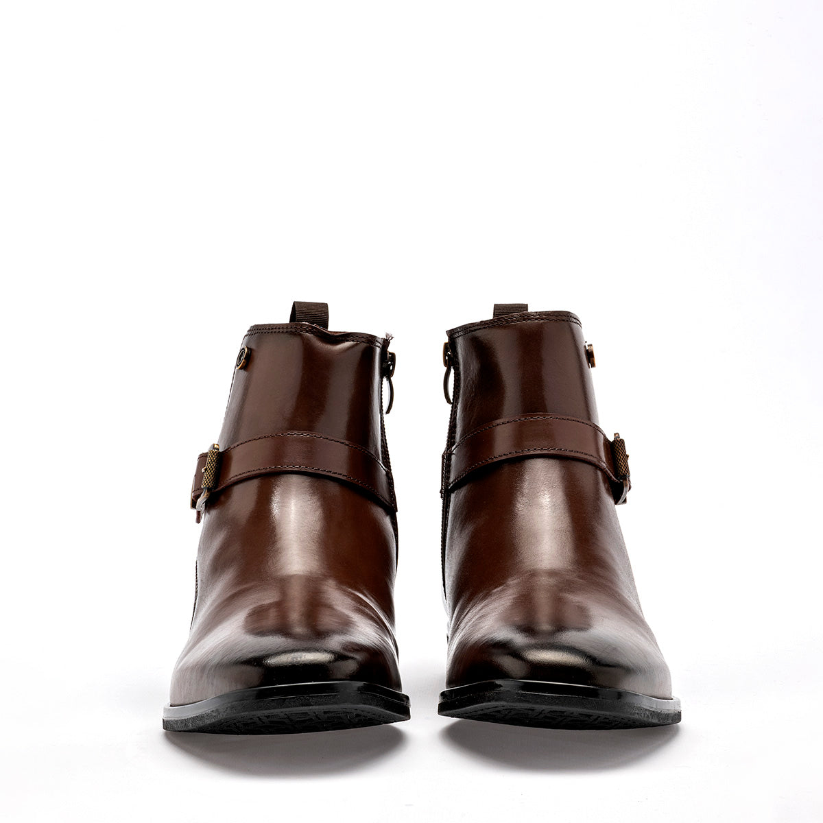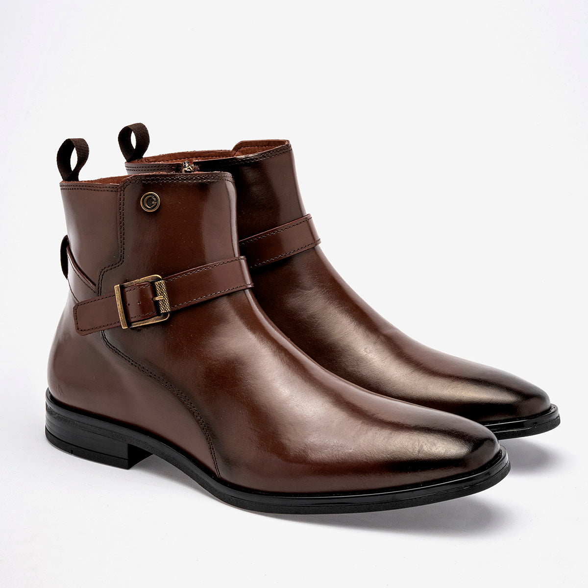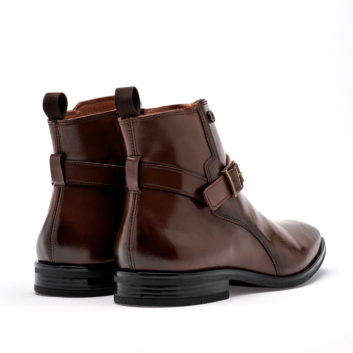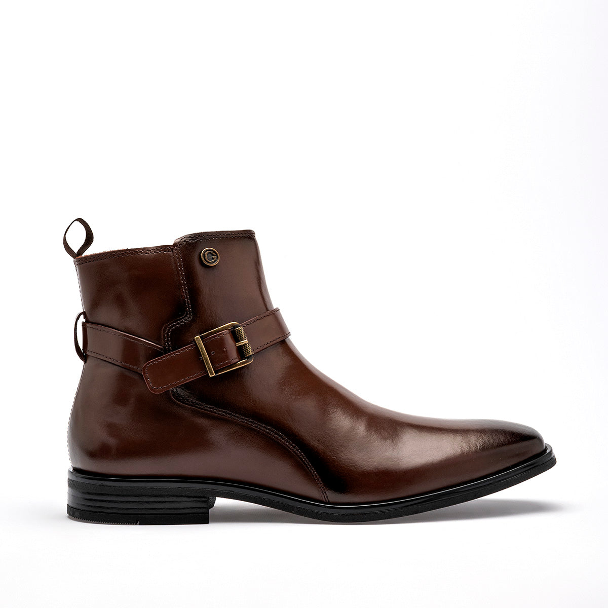Bota de vestir tipo Chelsea con cierre de hebilla en color marrón café con un elegante acabado degradado (patina) en la punta y el talón. El calzado está fabricado en piel o material sintético de alta calidad con un brillo sofisticado. Destaca por su correa decorativa con hebilla metálica en tono bronce que rodea el tobillo, un tirador posterior para facilitar el calce y una suela de vestir delgada con tacón bajo que mantiene una silueta esbelta y formal.
