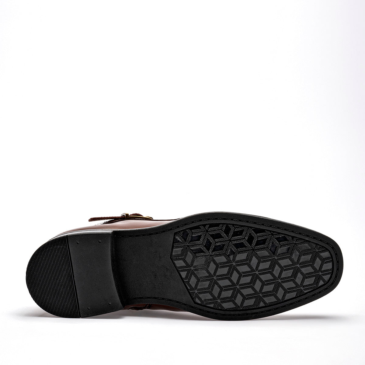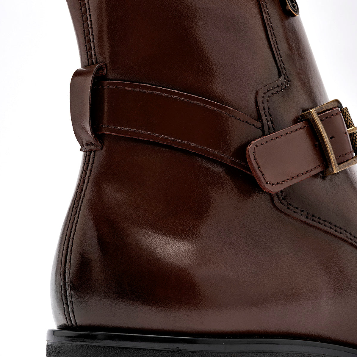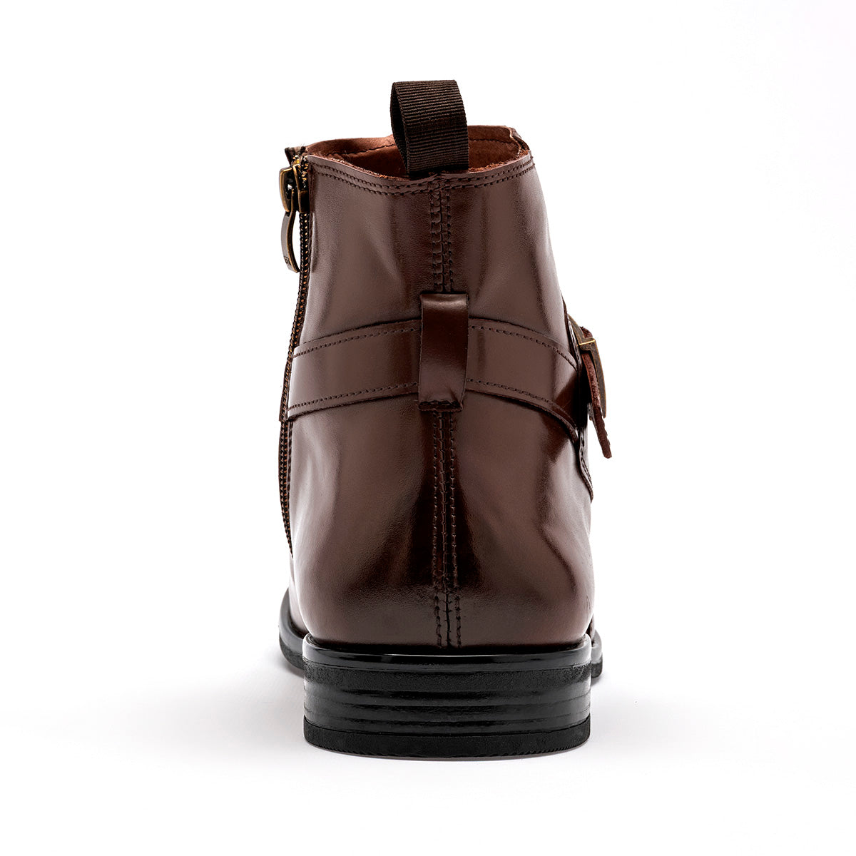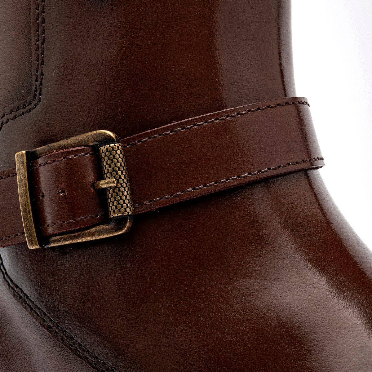 Bota de vestir tipo Chelsea con cierre de hebilla en color marrón café con un elegante acabado degradado (patina) en la punta y el talón. El calzado está fabricado en piel o material sintético de alta calidad con un brillo sofisticado. Destaca por su correa decorativa con hebilla metálica en tono bronce que rodea el tobillo, un tirador posterior para facilitar el calce y una suela de vestir delgada con tacón bajo que mantiene una silueta esbelta y formal.
