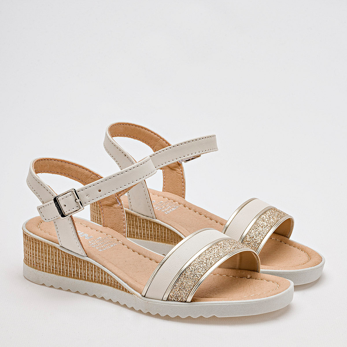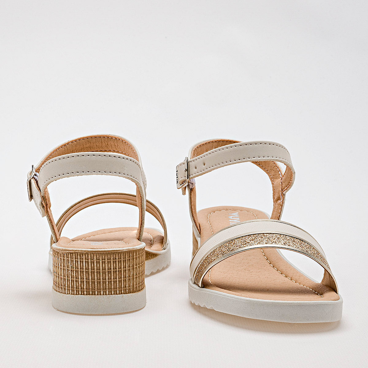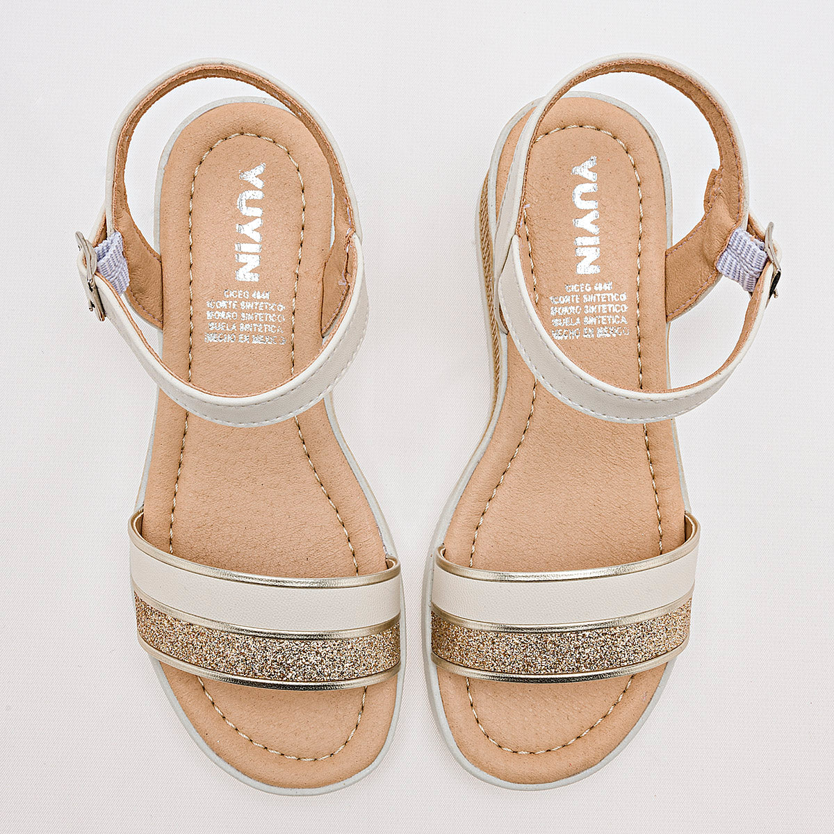 Estas sandalias blancas para niñas combinan a la perfección estilo y comodidad. Su diseño clásico y atemporal, junto con el toque de brillo del detalle dorado, las convierte en un calzado perfecto para cualquier ocasión especial.
