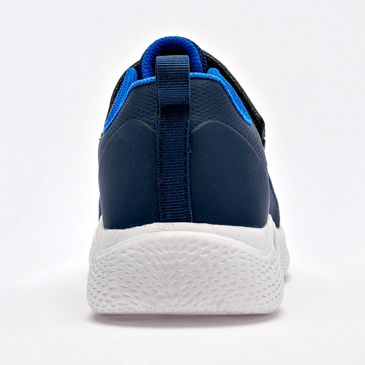 Tenis deportivo para niños diseñado para la comodidad y el movimiento. Presenta un cuerpo de malla textil transpirable en color azul marino, ideal para mantener el pie fresco. Su sistema de ajuste consta de doble correa de velcro, lo que permite un calce rápido y seguro. Destaca por sus detalles en azul eléctrico en el forro interior y un logotipo lateral en color rojo vibrante. La suela es de goma blanca con un patrón de tracción que proporciona estabilidad y ligereza al caminar.