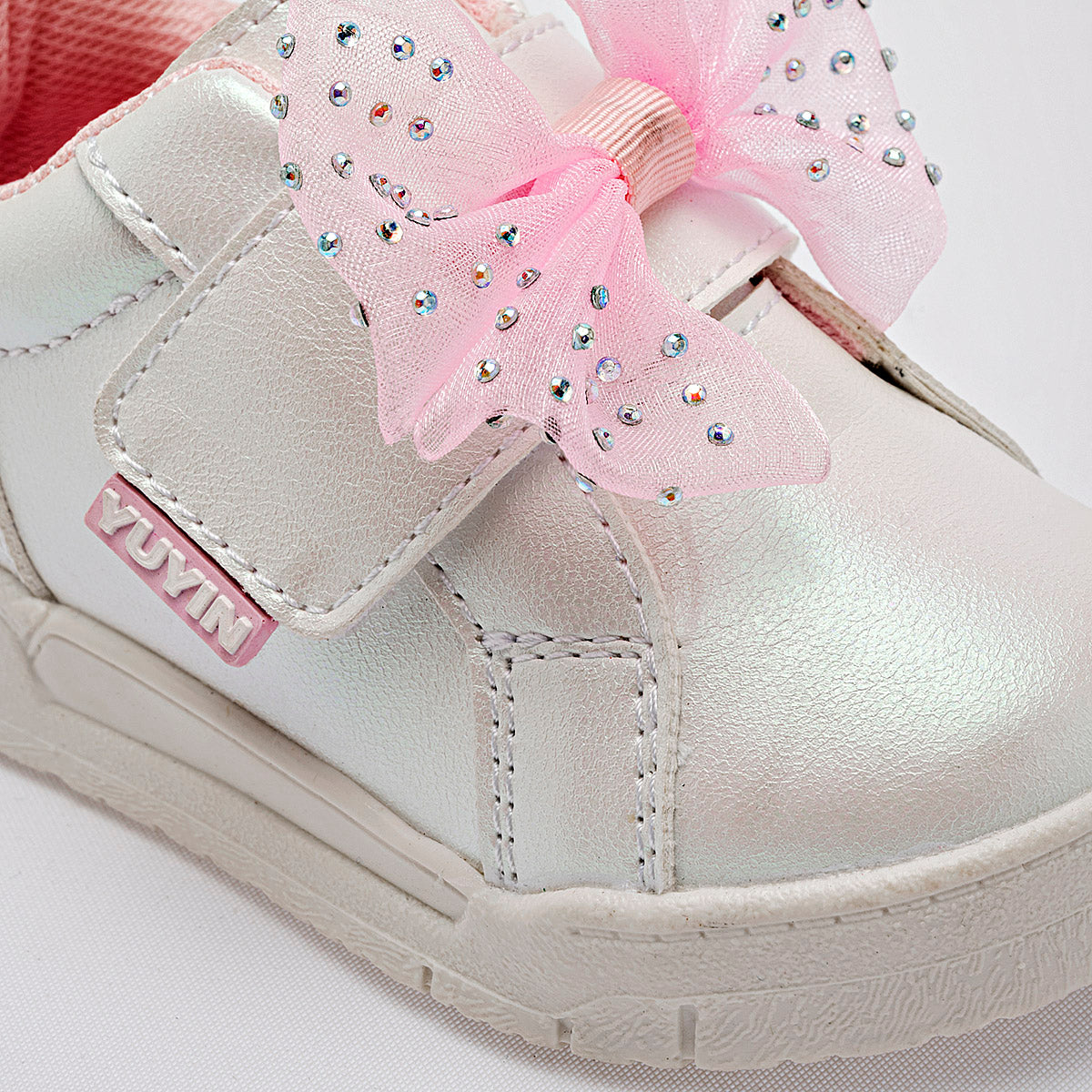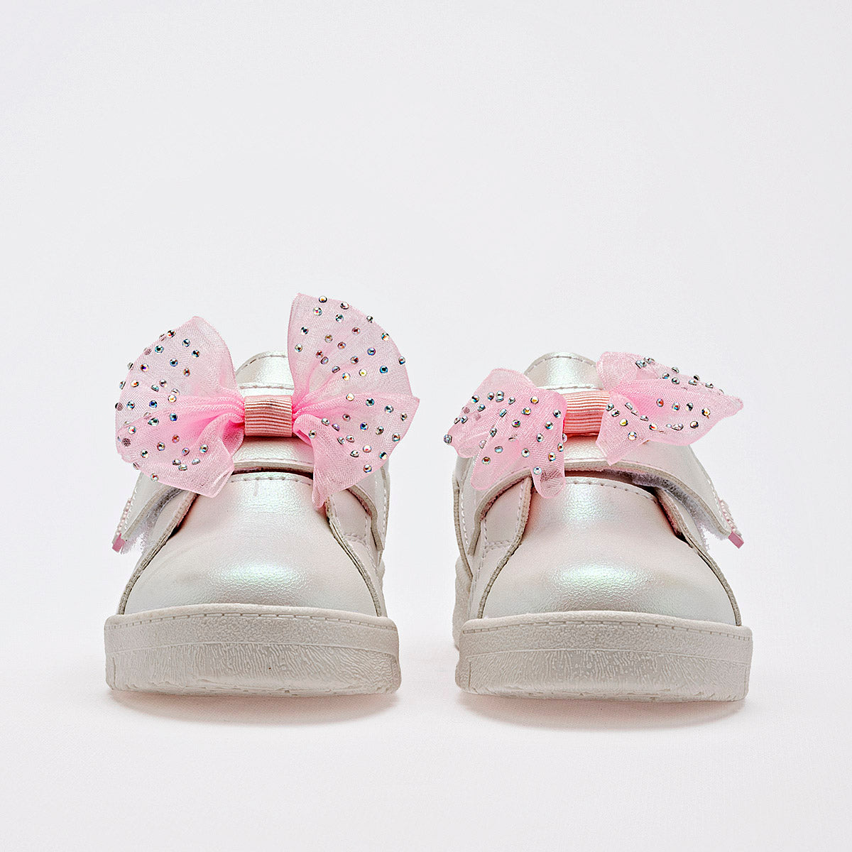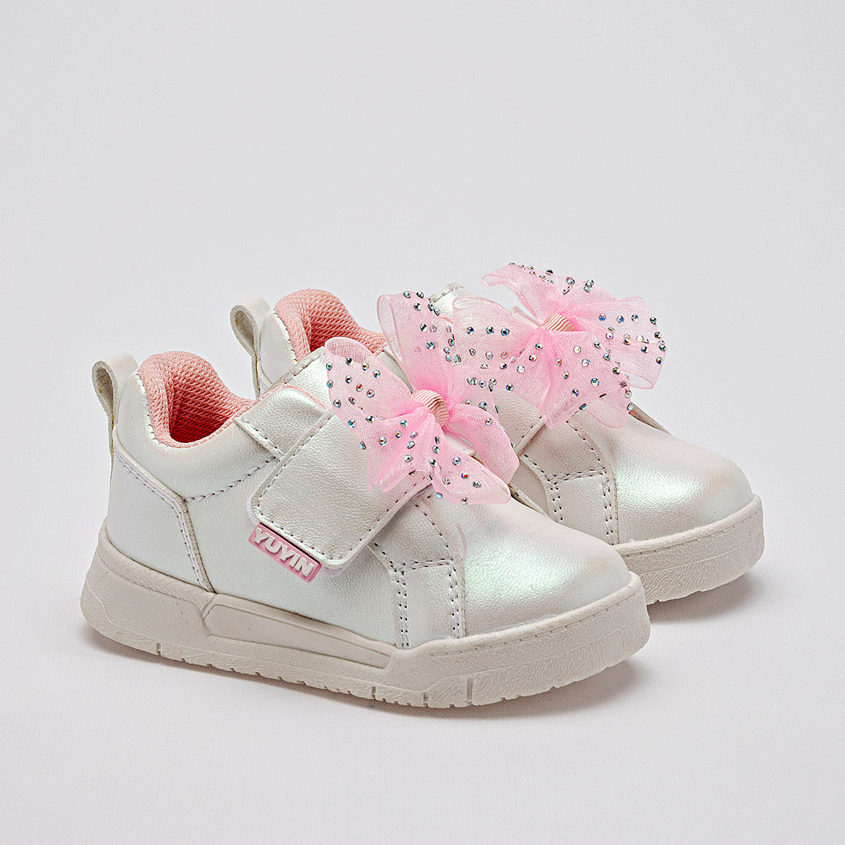 Tenis casuales para niña en color blanco con acabado aperlado que emite un brillo sutil y elegante. El diseño destaca por un gran moño de organza rosa adornado con pequeñas piedras brillantes de imitación sobre el empeine. Cuenta con un sistema de ajuste de velcro para facilitar su uso, interior acolchado en color rosa para mayor confort y una suela de goma blanca resistente y antideslizante.