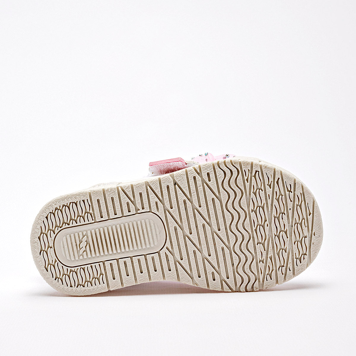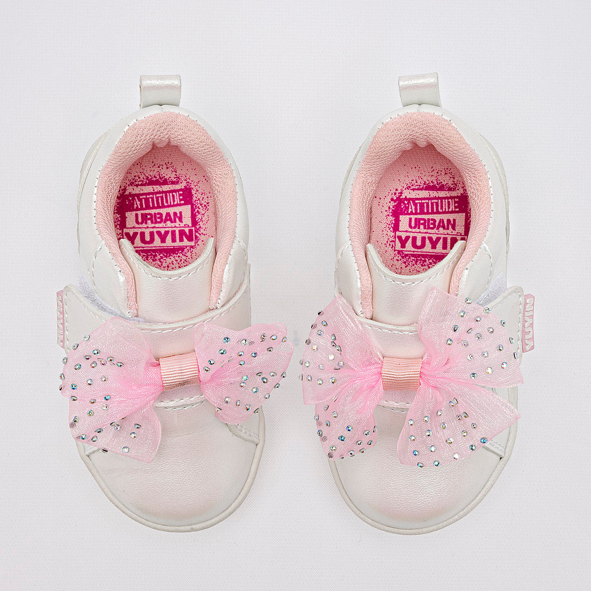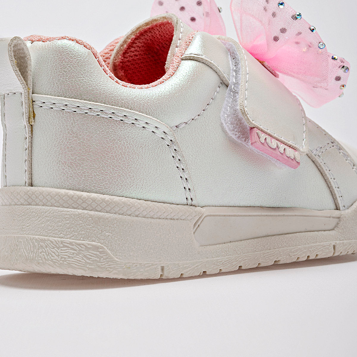 Tenis casuales para niña en color blanco con acabado aperlado que emite un brillo sutil y elegante. El diseño destaca por un gran moño de organza rosa adornado con pequeñas piedras brillantes de imitación sobre el empeine. Cuenta con un sistema de ajuste de velcro para facilitar su uso, interior acolchado en color rosa para mayor confort y una suela de goma blanca resistente y antideslizante.