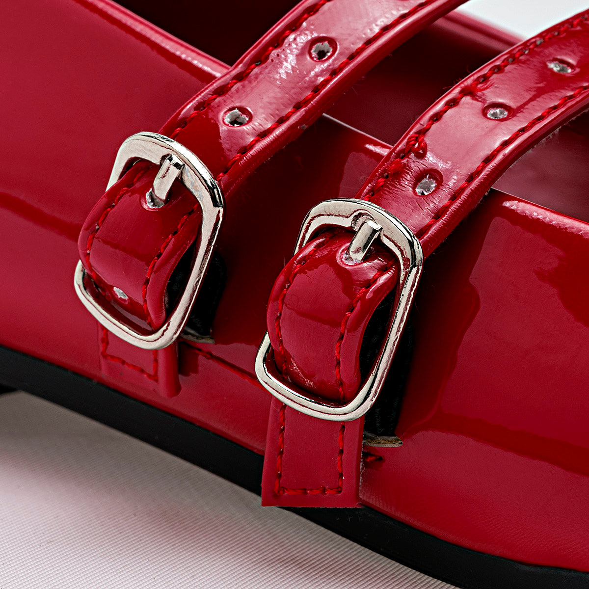 Estos zapatos combinan la sofisticación del charol rojo con la comodidad de un diseño plano y la actualidad de la punta cuadrada. Dos hebillas en el empeine permiten un ajuste personalizado.